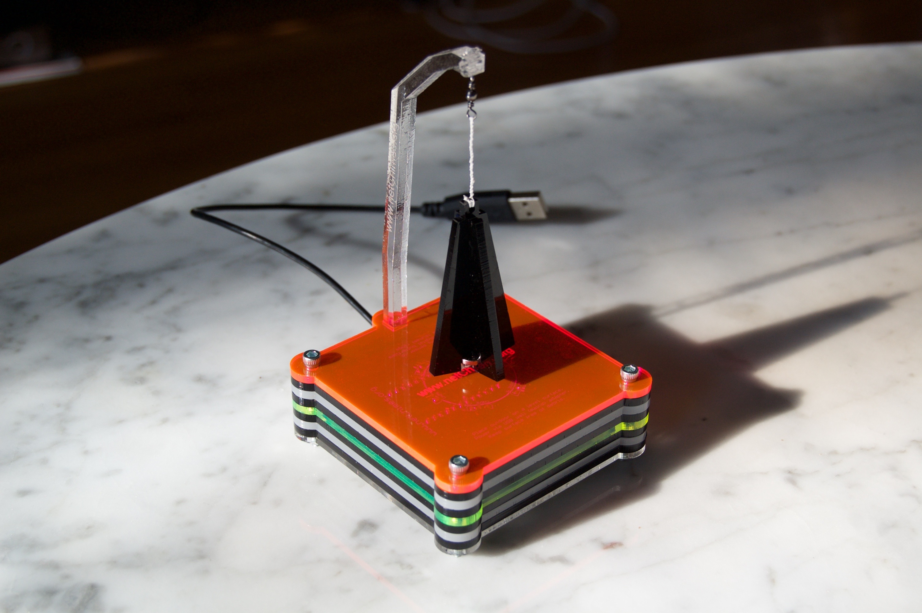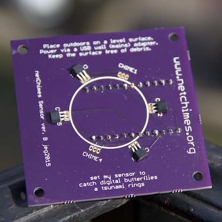 The netChimes sensor is a small, lightweight ambient sensor developed for this global installation project. When the sensor arrives at its destination, the sponsor (or chimekeeper) connects the sensor to a local Wi-Fi network and places it on a window sill or similar outdoor space.